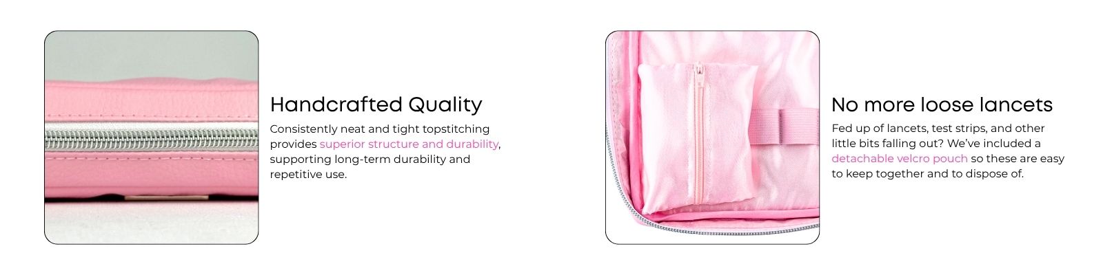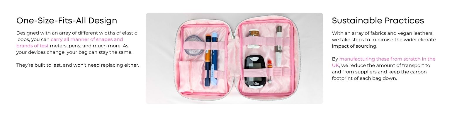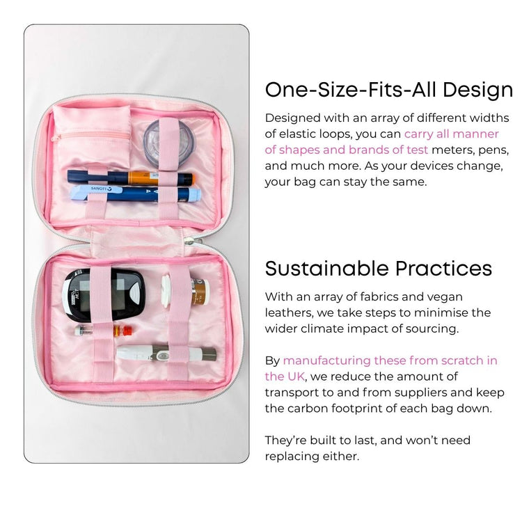 Built for real life with diabetes in mind. The Essentials Bag keeps everything in one place, from insulin pens and test kits to pump supplies and snacks. Each one is handmade in the UK by Bethany at Type One Style, with thoughtful compartments and removable sections so you can customise the inside to fit your routine. It’s protective, practical, and still looks beautiful on your bathroom shelf or in your tote.